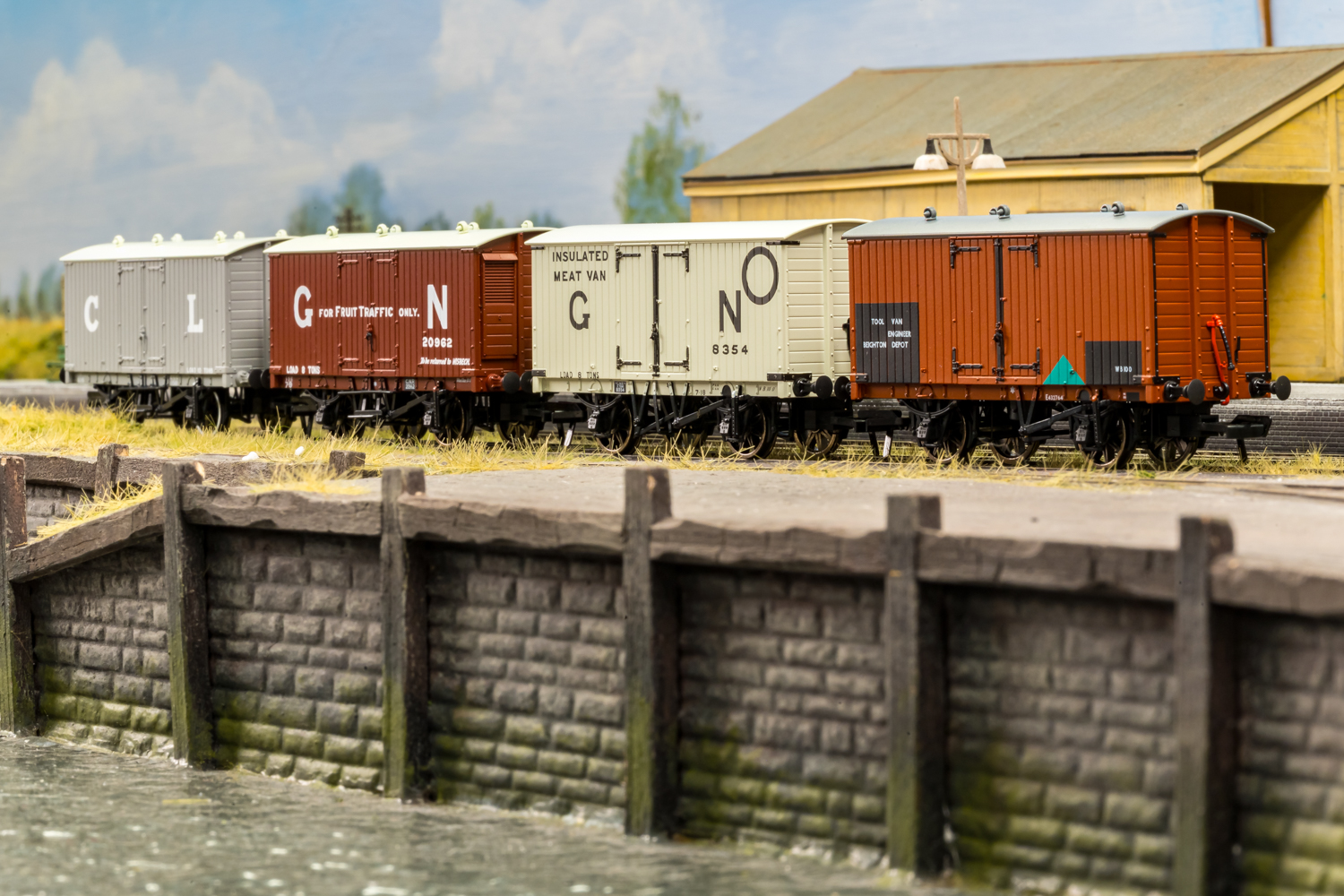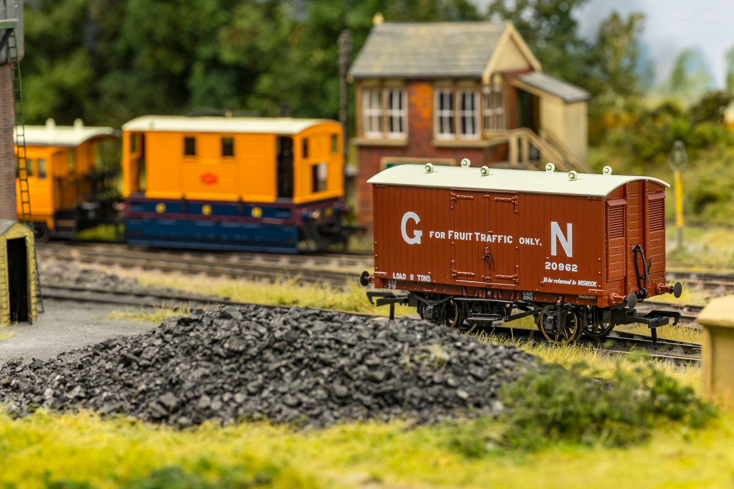 In addition to the conventional goods traffic, specific versions were also built to transport meat, fruit and other more hazardous materials. Conversions of 26 of the wagons took place between 1914 and 1916 to make them suitable for the carriage of explosives and gunpowder. Following the end of WW1 a further 49 were subsequently altered into insulated meat vans. Versions were also produced for the traffic of fruit, which included fitting shelves on the inside and side steps for easier access. Our research shows these being used for regular services on the adjacent Great Eastern Railway, with Wisbech being a permanent destination marking on some vehicles, so a perfect accompaniment for our J70 tram locomotives.